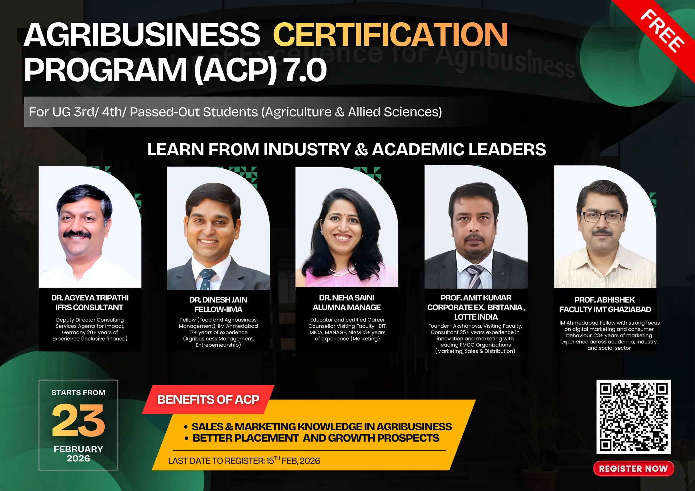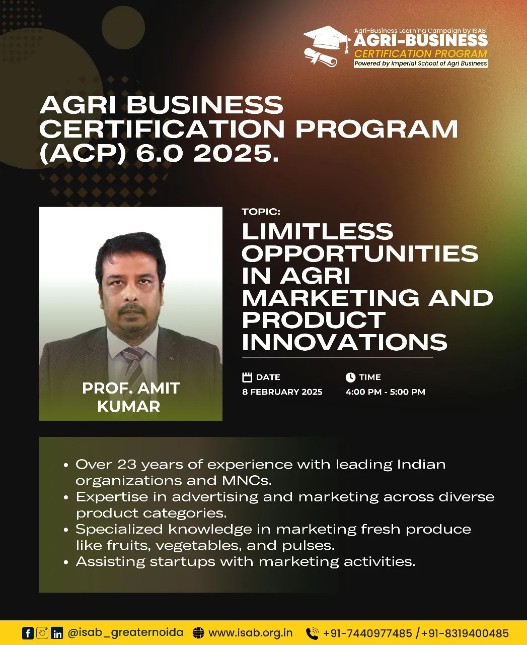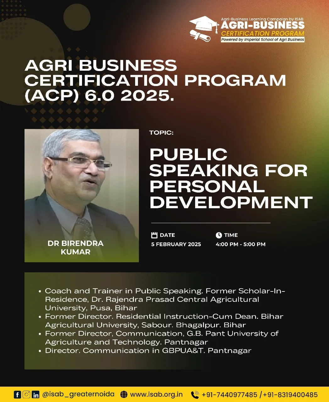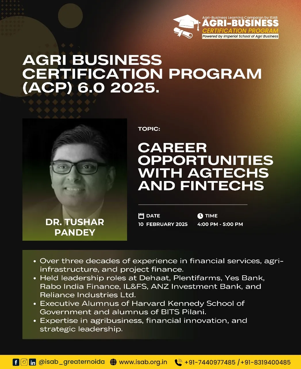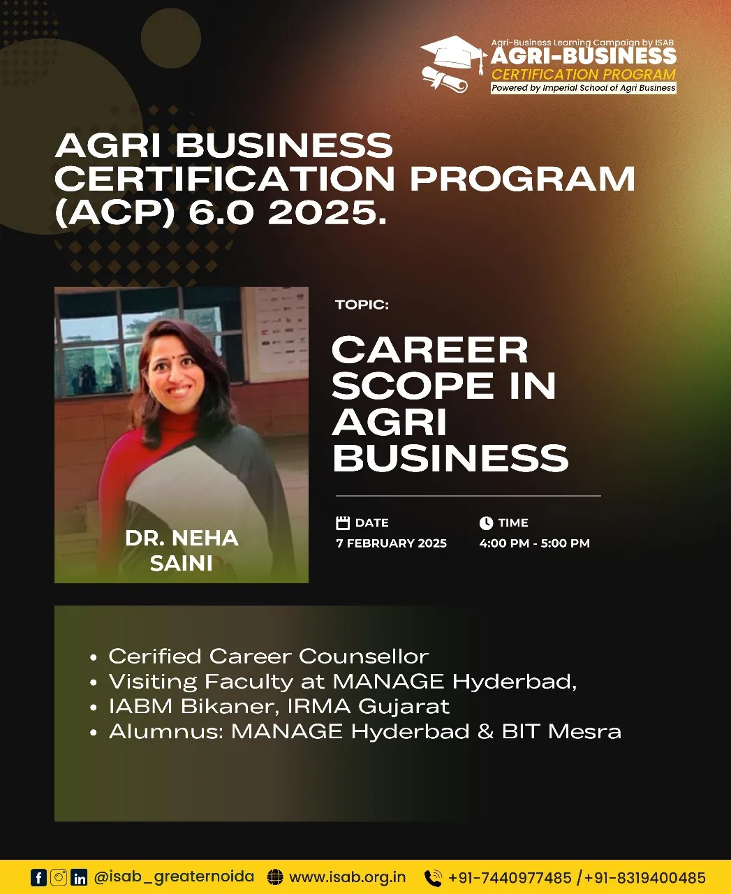 This year, we're elevating ACP 7.0 by introducing a hybrid model to cater to the evolving needs of Agriculture and allied students. Also, students who successfully complete the program and follow the prescribed guidelines will be invited to the ISAB Greater Noida campus for felicitation and will receive certificates and goodies.