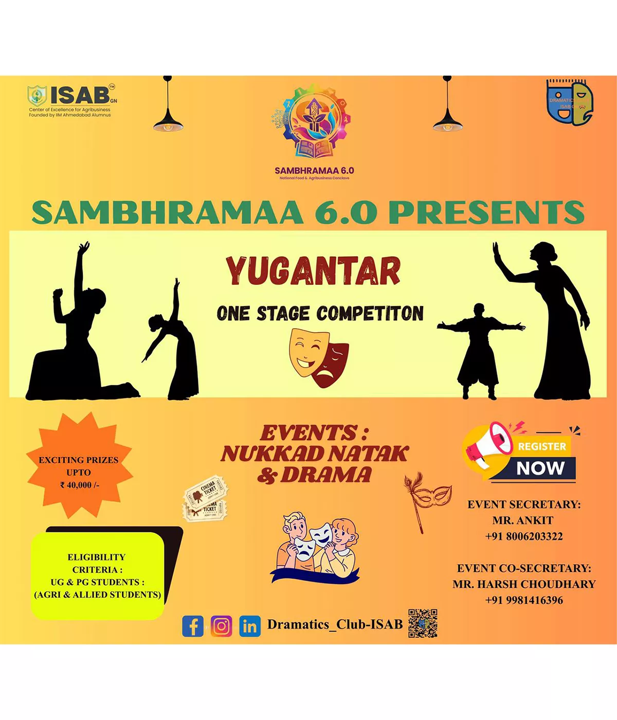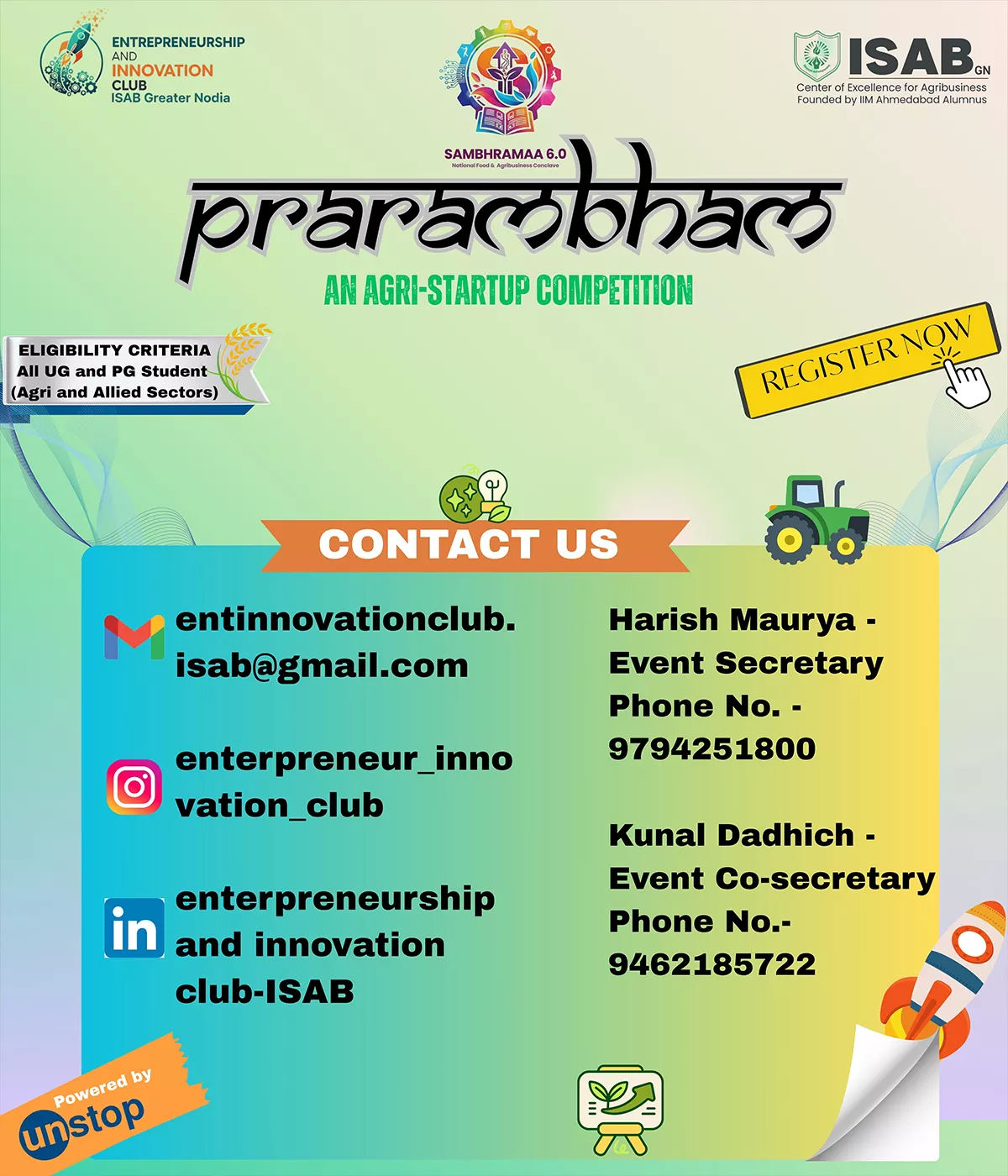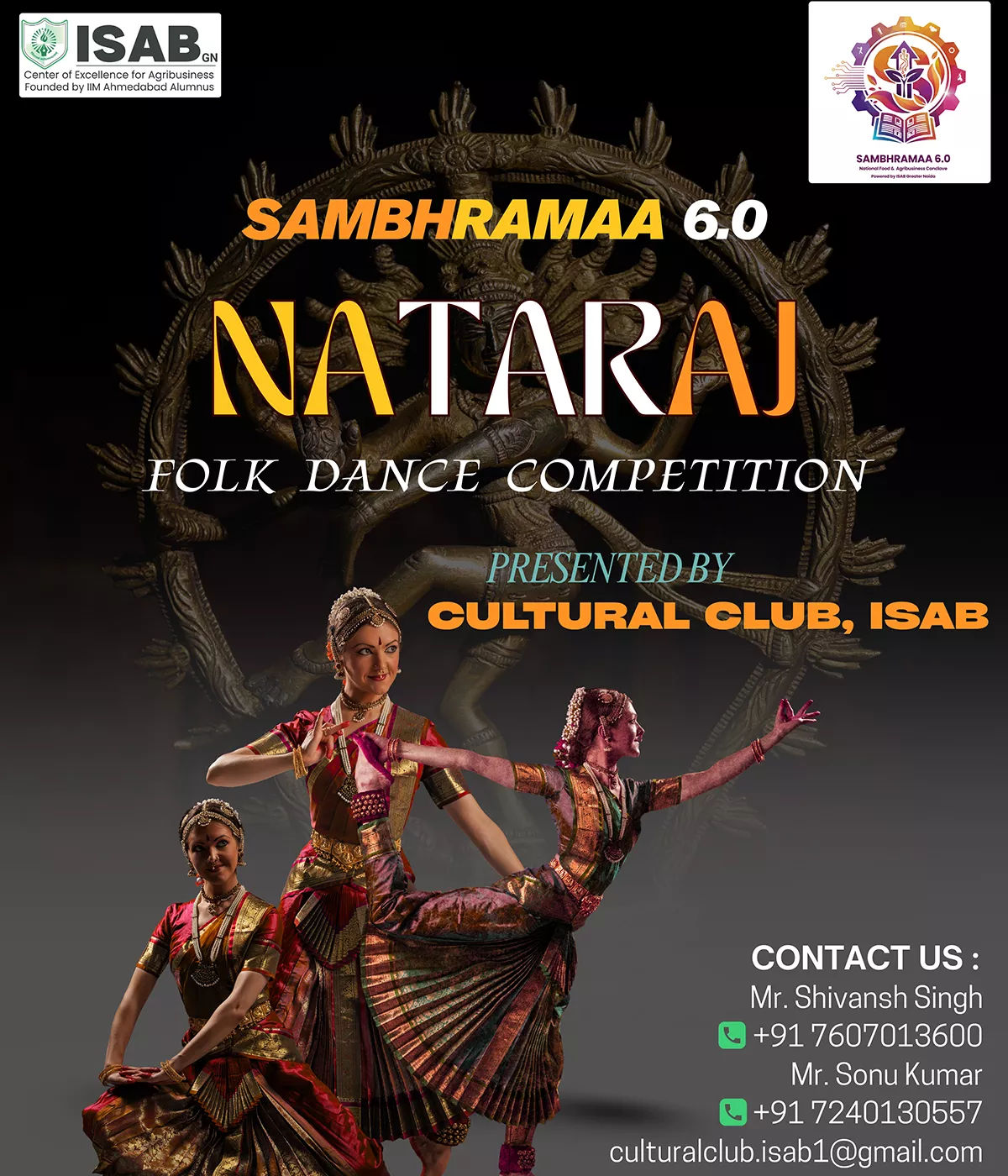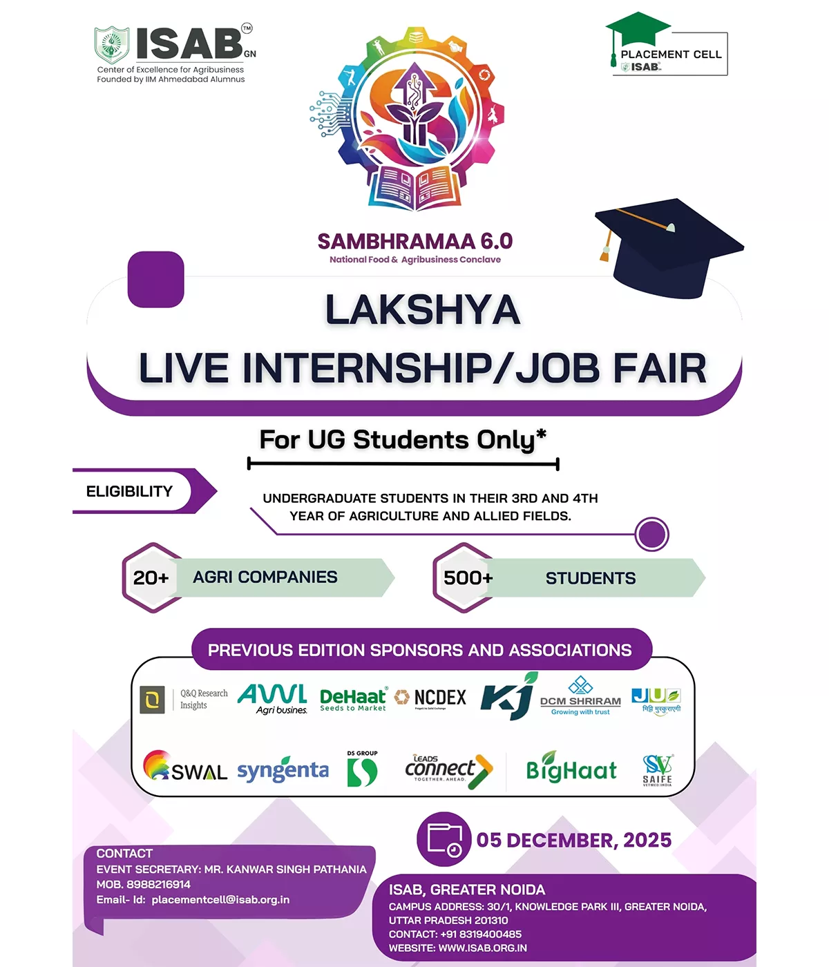 ISAB hosts nationwide conclave called “Sambhramaa” - National Food and Agribusiness Conclave, to provide a platform for undergraduate and postgraduate students from Agriculture and allied streams in order to showcase their talent in a competitive environment. We are happy to introduce this initiatives for UG and PG students for their personality enhancement and better career options as mentioned below.